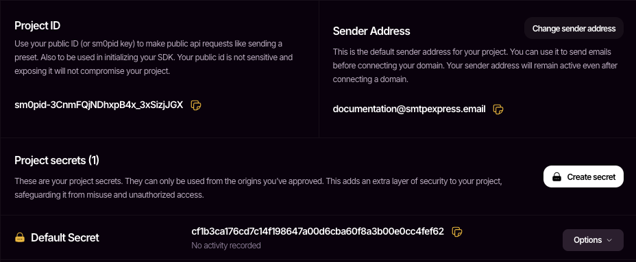 An SMTP Express project functions like a dedicated mail server. This enables you to send (transactional and promotional) and also receive emails. Each project on SMTP Express is assigned three key credentials: a Sender Address, Project ID, and Project Secret