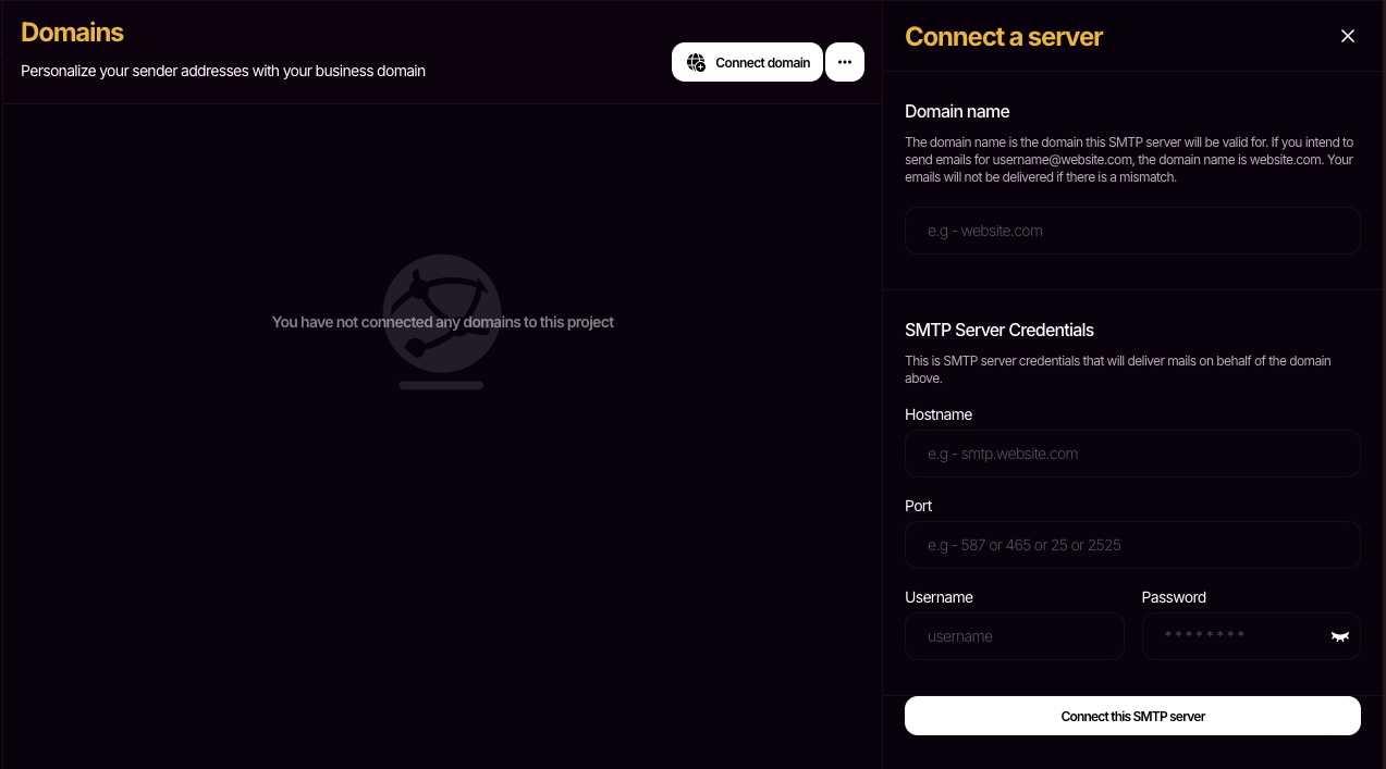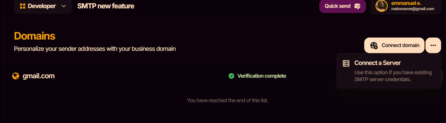 As you can see from the image, I have already connected my gmail account, but I will walk you through how to set up yours. Start by clicking on the three dots beside the connect domain button and select connect server. You will be presented with a form that requires you to input your domain name and SMTP credentials.